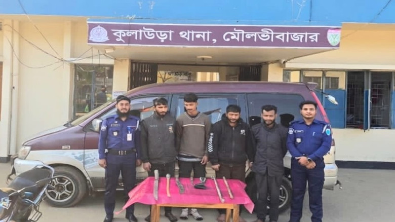 মৌলভীবাজারে ডাকাতি করে পালানোর সময় অস্ত্র ও লুন্ঠিত মালামালসহ আটক ৪