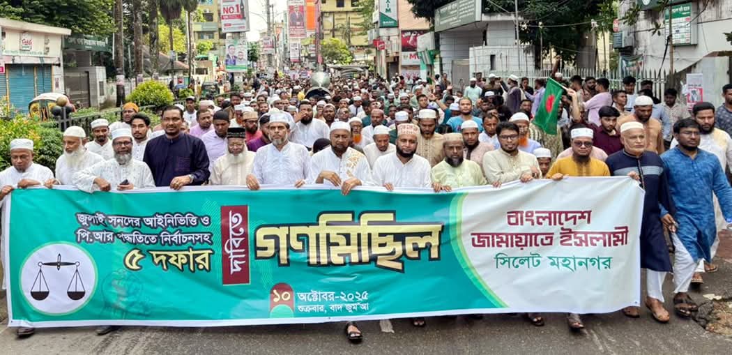জুলাই সনদের আইনী ভিত্তি, পিআর পদ্ধতিতে নির্বাচনসহ ৫ দফা দাবিতে বিক্ষোভ সমাবেশ শেষে কোর্টপয়েন্ট থেকে বিশাল গণমিছিল বের করা হয়। মিছিলটি নগরীর গুরুত্বপূর্ণ পয়েন্টর প্রদক্ষিণ করে চৌহাট্টা পয়েন্টে গিয়ে সমাপ্ত হয়। মিছিলে সিলেট মহানগর ও বিভিন্ন থানা-ওয়ার্ড-ইউনিটের হাজার হাজার জনশক্তি অংশ নেন।
