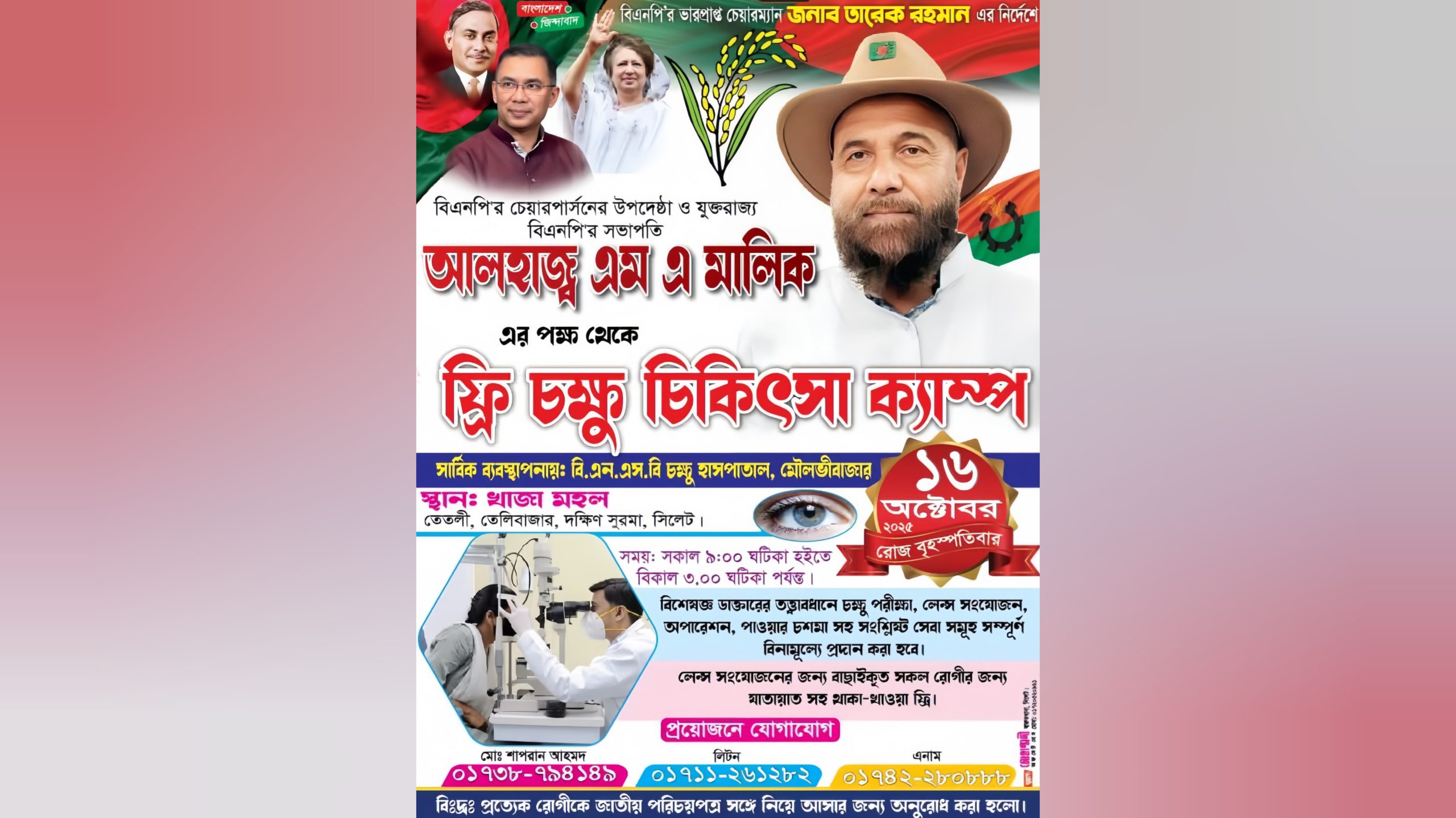 দক্ষিণ সুরমায় যুক্তরাজ্য বিএনপির সভাপতি এম এ মালিকের ফ্রি চক্ষু চিকিৎসা ক্যাম্প আজ
