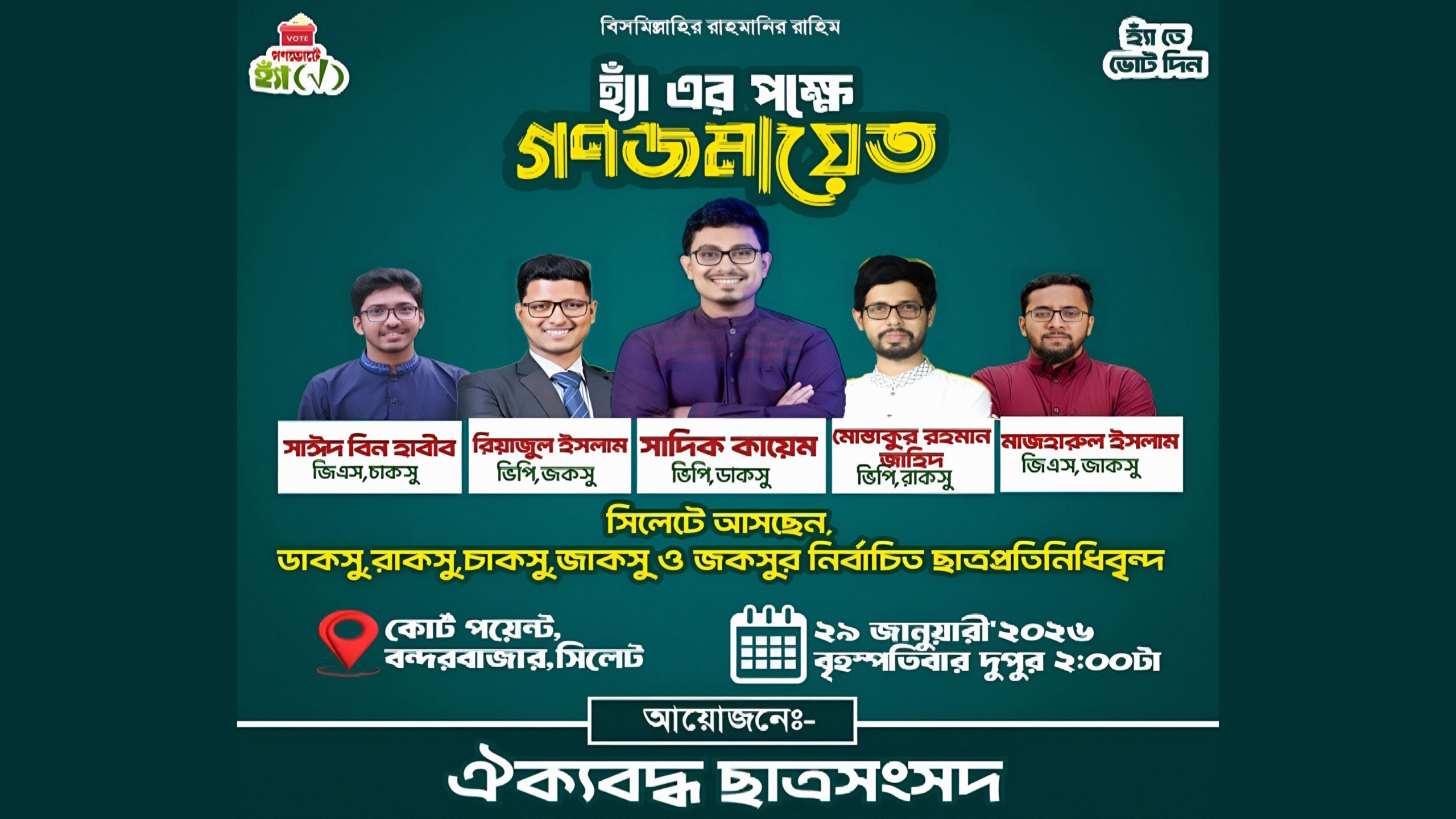 গণভোটে ‘হ্যাঁ’-এর পক্ষে প্রচারণায় কাল সিলেটে আসছেন ছাত্রসংসদগুলোর ভিপি-জিএস