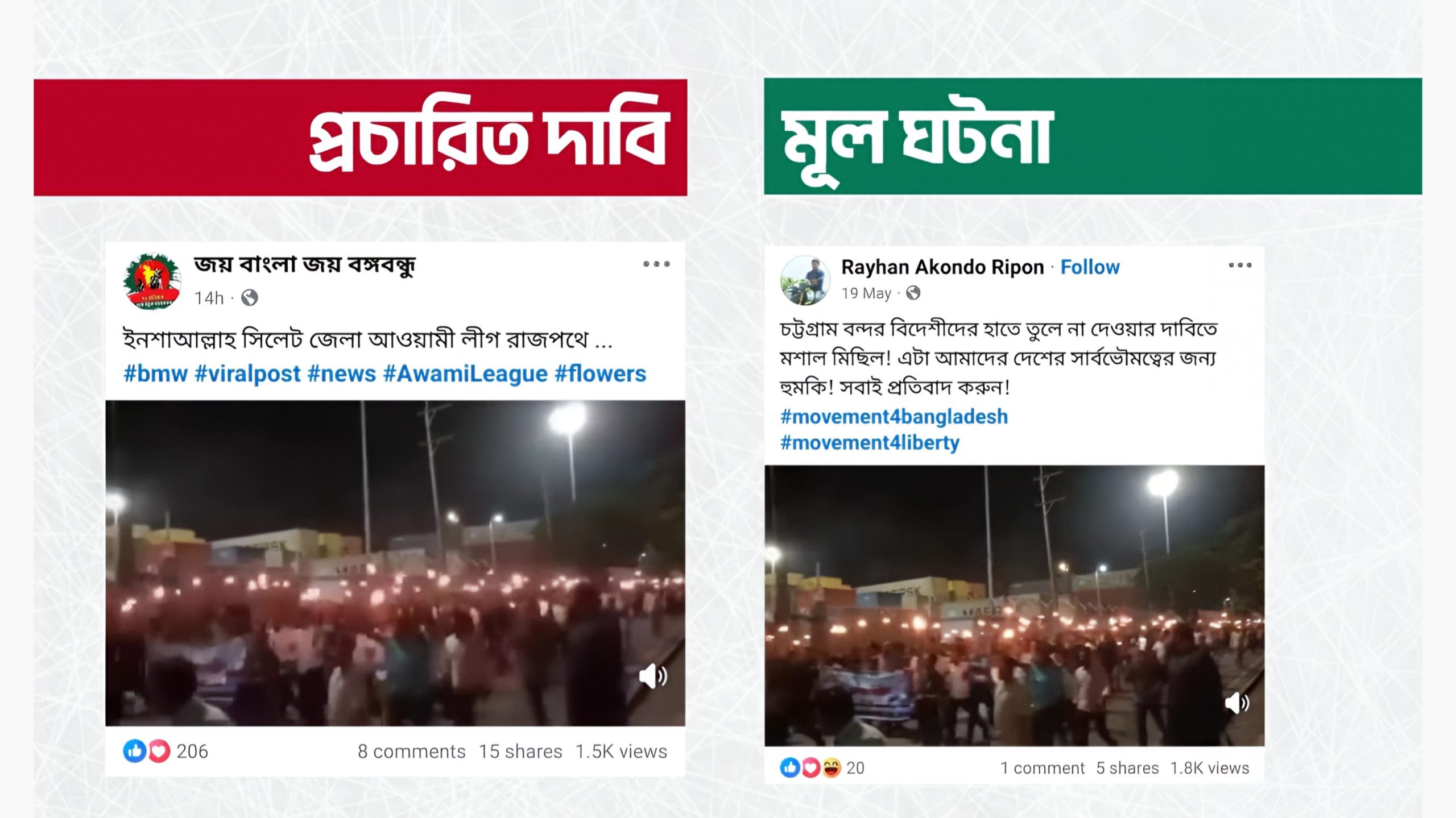 রিউমর স্ক্যানার টিমের অনুসন্ধানে জানা যায়, এটি সাম্প্রতিক সময়ে সিলেটে আওয়ামী লীগের মিছিলের ভিডিও নয়। প্রকৃতপক্ষে, গত ১৯ মে চট্টগ্রাম বন্দরের টার্মিনালে বিদেশি অপারেটর নিয়োগ উদ্যোগের প্রতিবাদে শ্রমিক দলের মশাল মিছিলের ভিডিও।